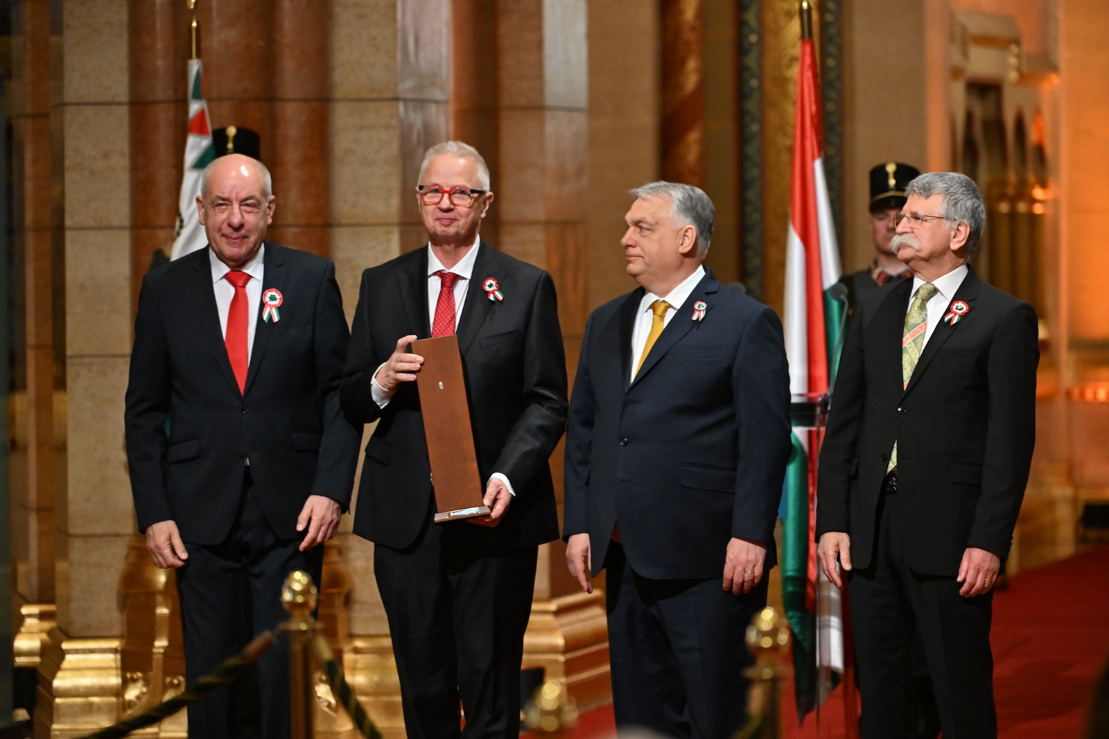 Written and translated by Tamás Bodoky. You can read the Hungarian version of the story here. Cover photo: László Trócsányi, legal scholar, university professor, rector, former constitutional court judge, minister, and ambassador, receives the Széchenyi Prize at the ceremonial presentation of the Kossuth and Széchenyi Prizes, held on the occasion of the anniversary of the 1848–49 Revolution and War of Independence in the Dome Hall of the Parliament Building on March 14, 2026. Standing next to him are President Tamás Sulyok, Prime Minister Viktor Orbán, and László Kövér, Speaker of the National Assembly. Photo: MTI/Tibor Illyés