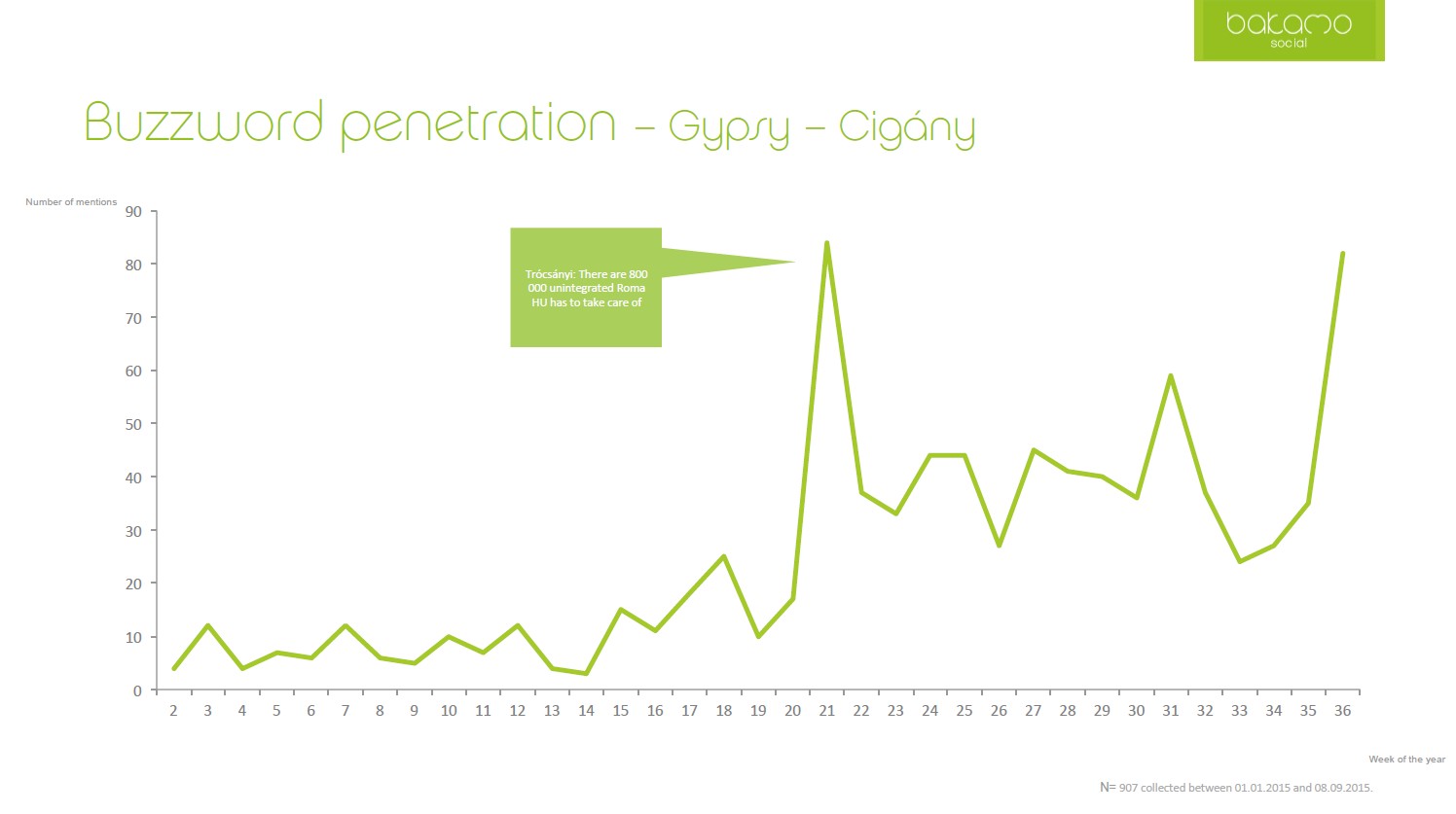 In January 2015, the refugee issue was barely present in the Hungarian-language online public sphere. According to a 2016 study commissioned by the Open Society Foundations and conducted by Bakamo.Social, mentions of Roma in this context did not become widespread as a result of international events, but rather surged when the Hungarian government built a campaign around it with Trócsányi’s statement.